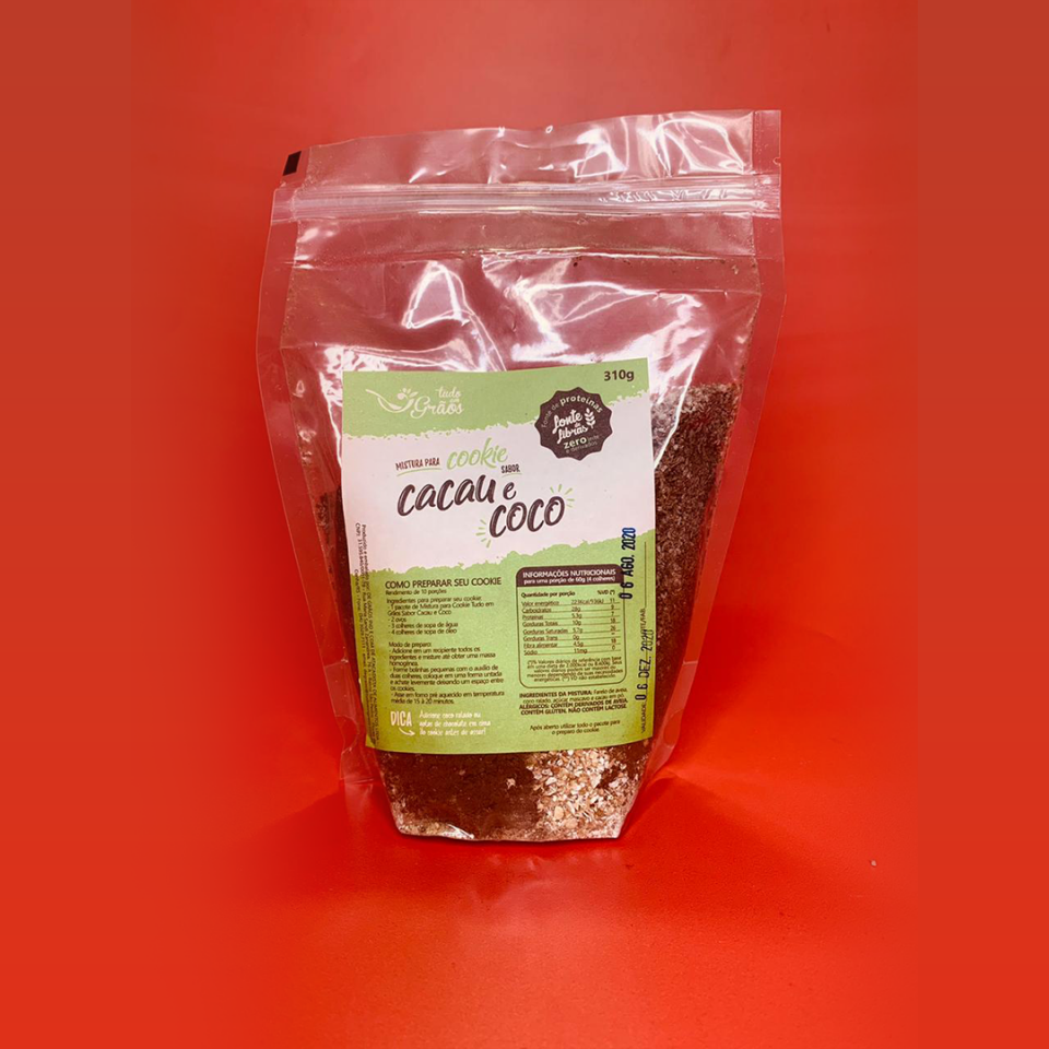 Para preparar os seus cookies de cacau e coco, você vai precisar de 01 pacote da Mistura de Cookies de Cacau e Coco da Tudo em Grãos, 02 ovos, 03 colheres de sopa de água e 04 colheres de sopa de óleo. Misture bem todos os ingredientes até obter uma massa homogênea, forme bolinhas pequenas, coloque em uma forma untada, achate levemente, deixando um bom espaço entre os cookies. Asse em forno preaquecido em temperatura média de 15 a 20 minutos.